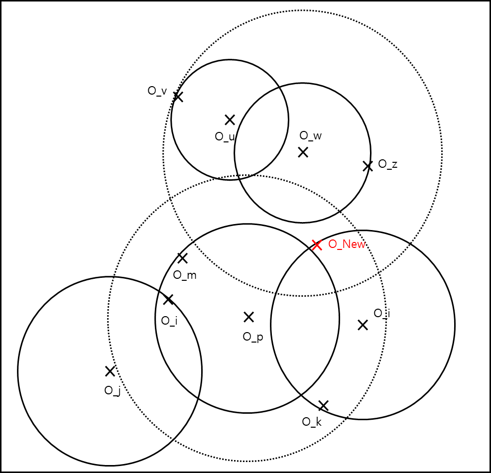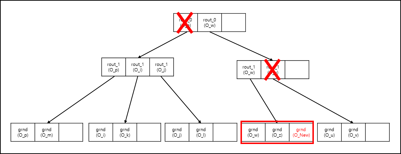 - 다시 위로 올라가서 루트 노드로 가서 rout0(O_w)의 하위 노드를 검사한다. 하지만 하위 노드의 객체들의 원은 O_New를 포함하지 않으므로 가지치기된다.