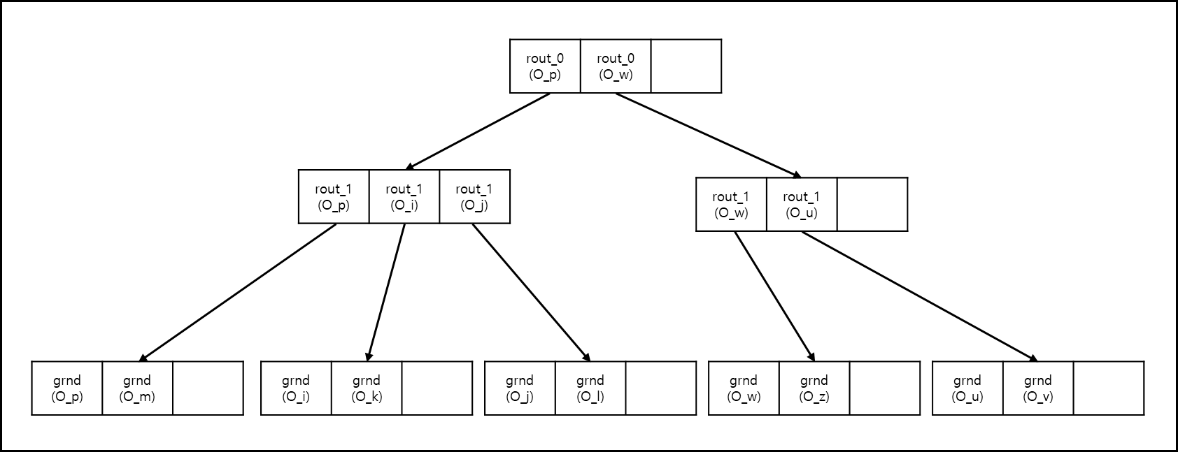 위에서 rout과 grnd라고 표시한 두 종류의 엔트리가 있다. rout은 routing object를 말하며, grnd는 ground object를 말한다. 이는 각각 Internal node와 Leaf node가 object들을 담고 있다. 이에 대한 설명은 아래와 같다.