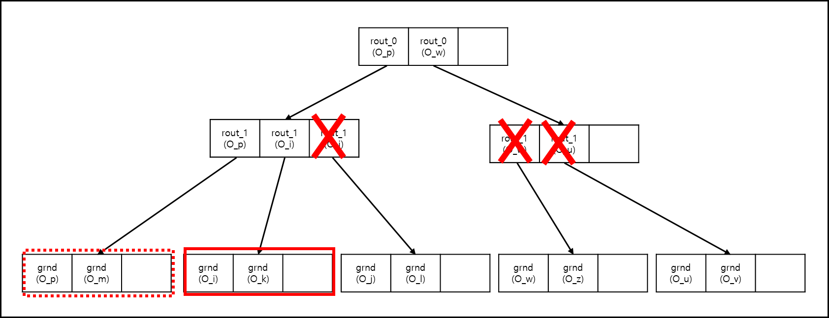 - rout0(O_p)의 하위 노드를 확인하여 각 엔트리의 원에 포함되는지 확인한다. rout1(O_p)와 rout1(O_i)는 포함되지만 rout1(O_j)는 포함되지 않는다. 먼저 rout1(O_p)의 하위 노드를 탐색한다.