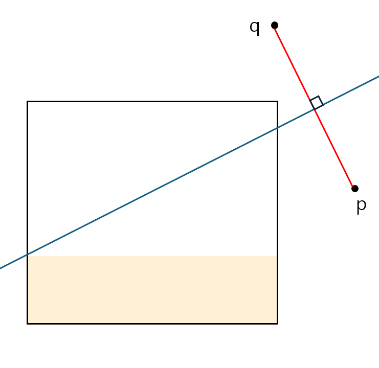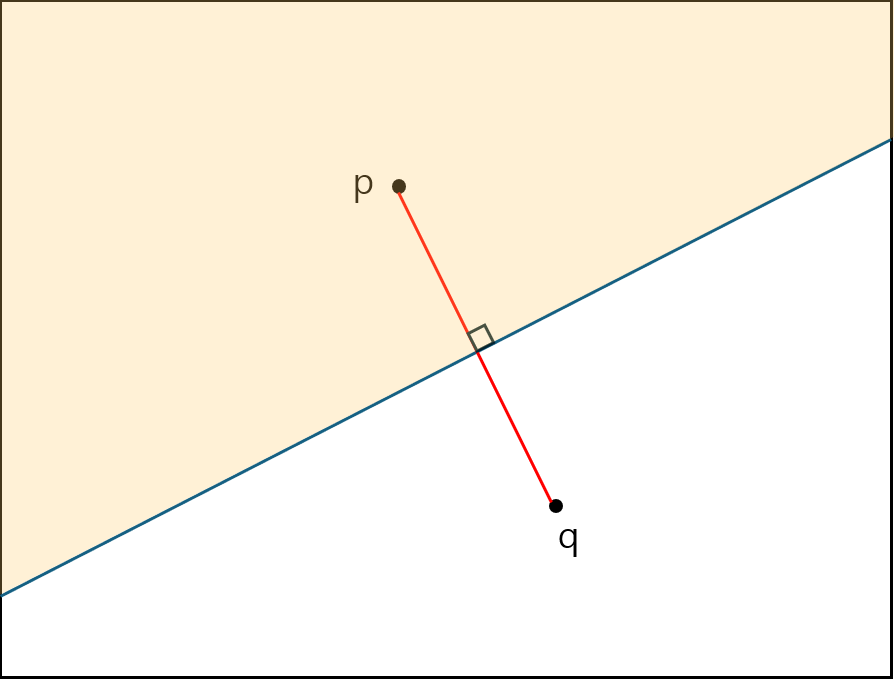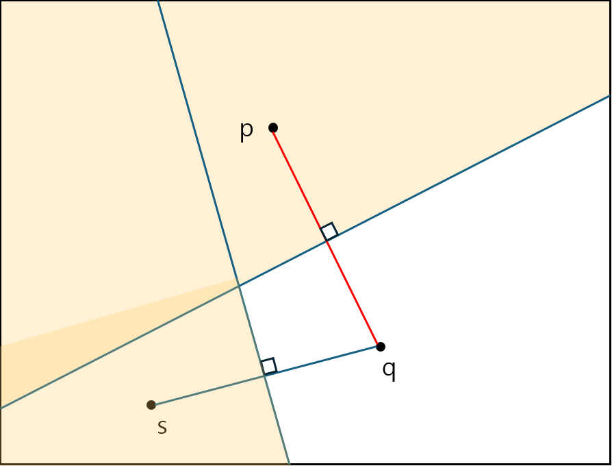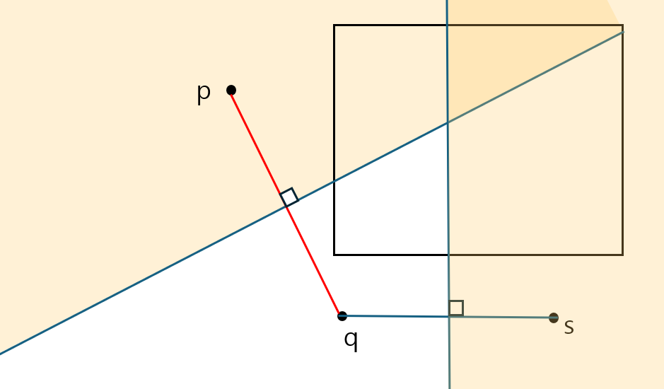 query와 어떤 점 p가 최 근접이라면 p와 그은 선분을 이등분 한 점에서 직각으로 선을 그었을 때 절반만큼의 영역에 속한 점은 q에 가까울 수 없다.
