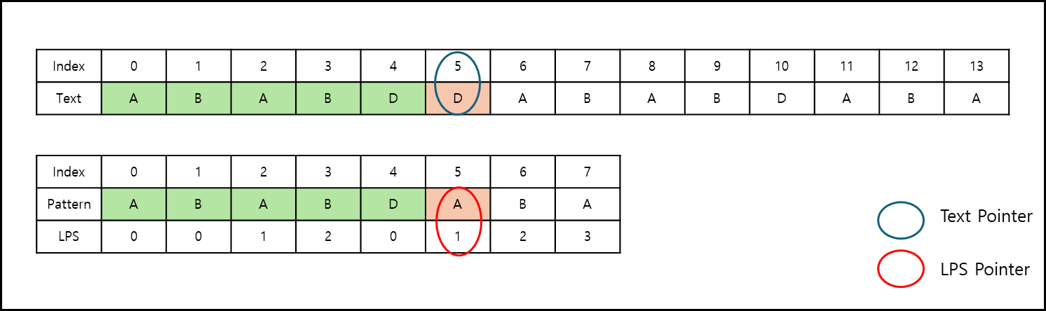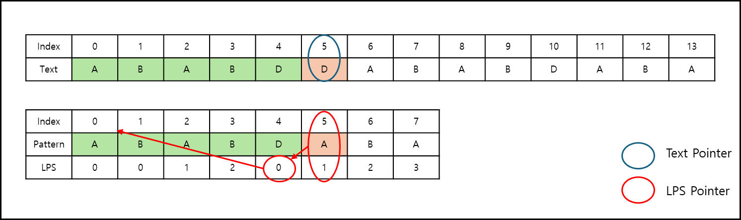 LPS Pointer는 A를 가리키나 현재 텍스트값은 D이다. 맞지 않는데, 이미 LSP Pointer의 Index가 0이므로 Text Pointer를 1 옮긴다.