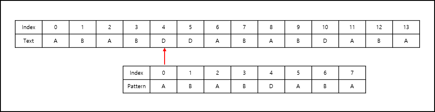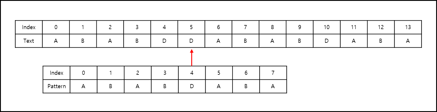 index 5에서 불일치가 일어났다. 불일치 값은 D이므로 패턴중에 가장 오른쪽에 있는 D값을 찾아서 아래의 그림과 같이 땡긴다.