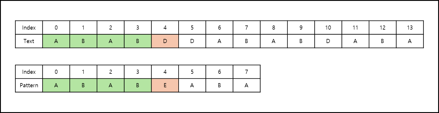 각 길이별 prefix와 suffix의 일치길이를 표로 만들어서 LPS로 표현해놓은 표이다. 만약 텍스트 “ABABDDABABDABA” 에서 패턴 “ABABDABA”를 찾는다고 할 때 아래와 같다.