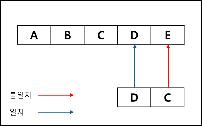 예를 들어 ABCD 라는 텍스트에서 DC라는 문자열을 단순 구현으로 검색하려고한다면 아래와 같은 과정을 거쳐야한다.