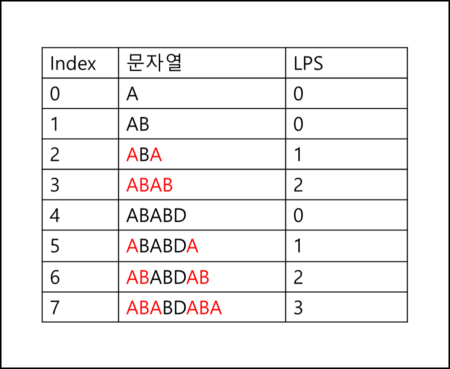 패턴 “ABABDABA”이 있을때 LPS 값은 아래와 같다.