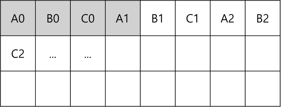 회색 음영으로 칠한 부분이 Cache miss로 인해 갖고 온 블럭이라고 할 때 갖고온 Cache 부분이 아닌 다른 부분을 접근하기 때문에 또 Cache miss가 나게 된다.