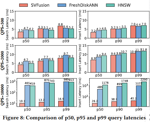 QPS를 낮음(500)→중간(2000)→높음(10000)으로 확장한 실험 저부하에서는 p99가 약 몇 ms 수준(예: 전체적으로 < 10ms), 동기화 비용 때문에 약간의 오버헤드가 있었음. 중간 부하에서는 p50 ≈ 4.3ms, p99 ≈ 7.9ms(논문 지표). 고부하에서는 baselines의 p99가 > 900ms로 폭등한 반면 SVFusion은 검색 p99 ≈ 16.5ms, 삽입 p99 ≈ 45.3ms로 견고하게 유지되었다.